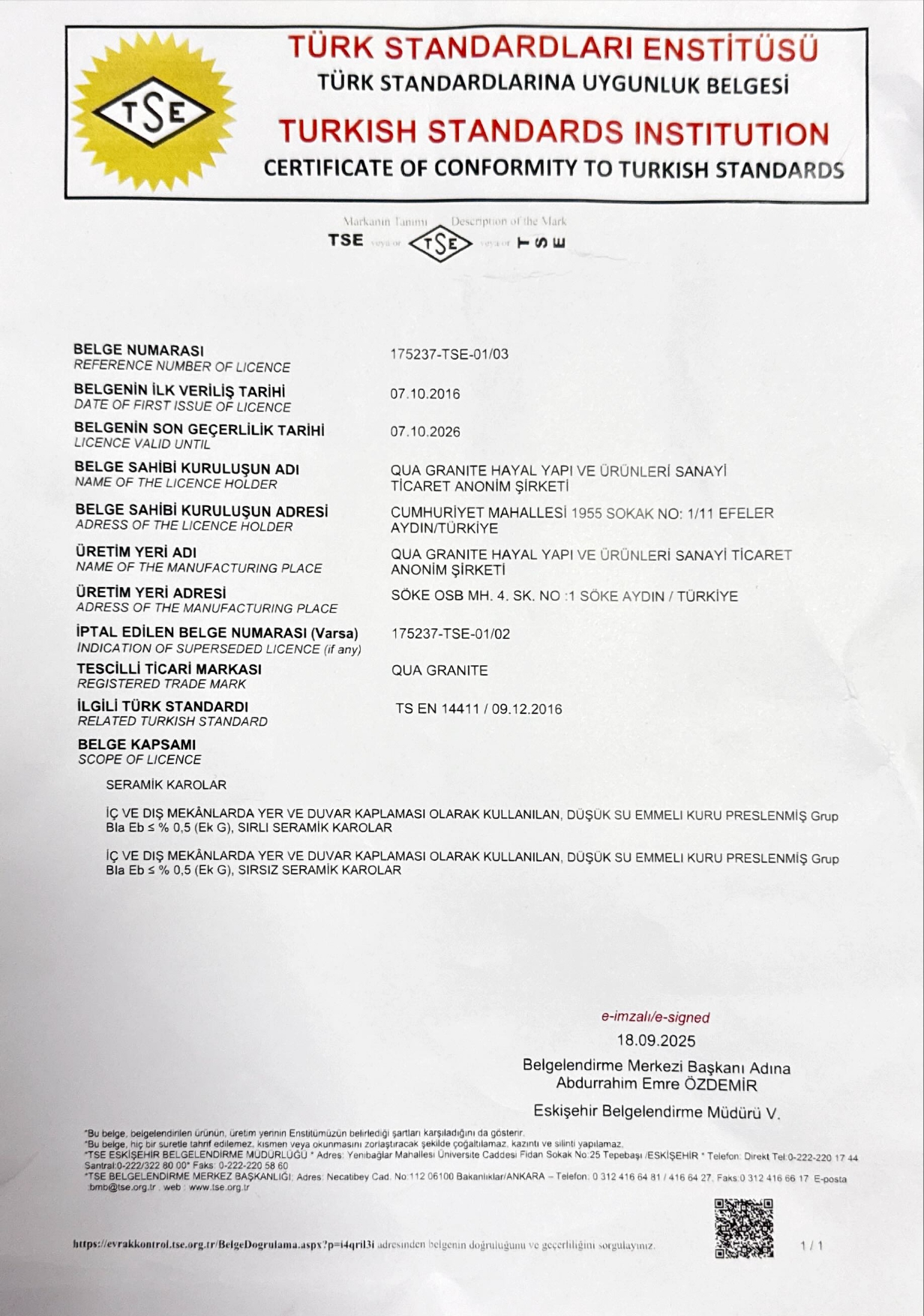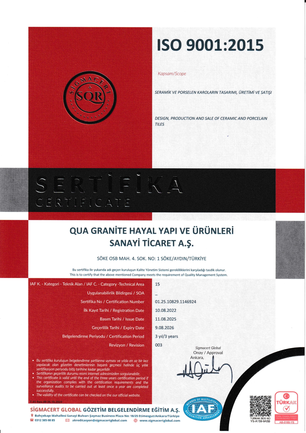 • Kalite Sertifikaları