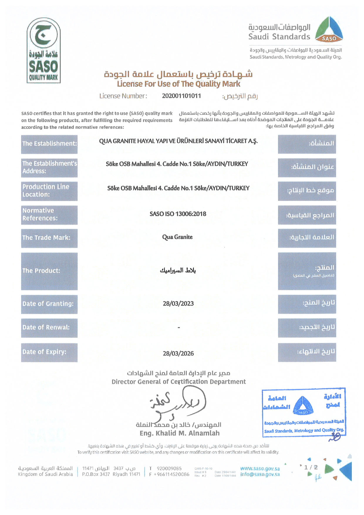 SASO - Quality Mark Certificate